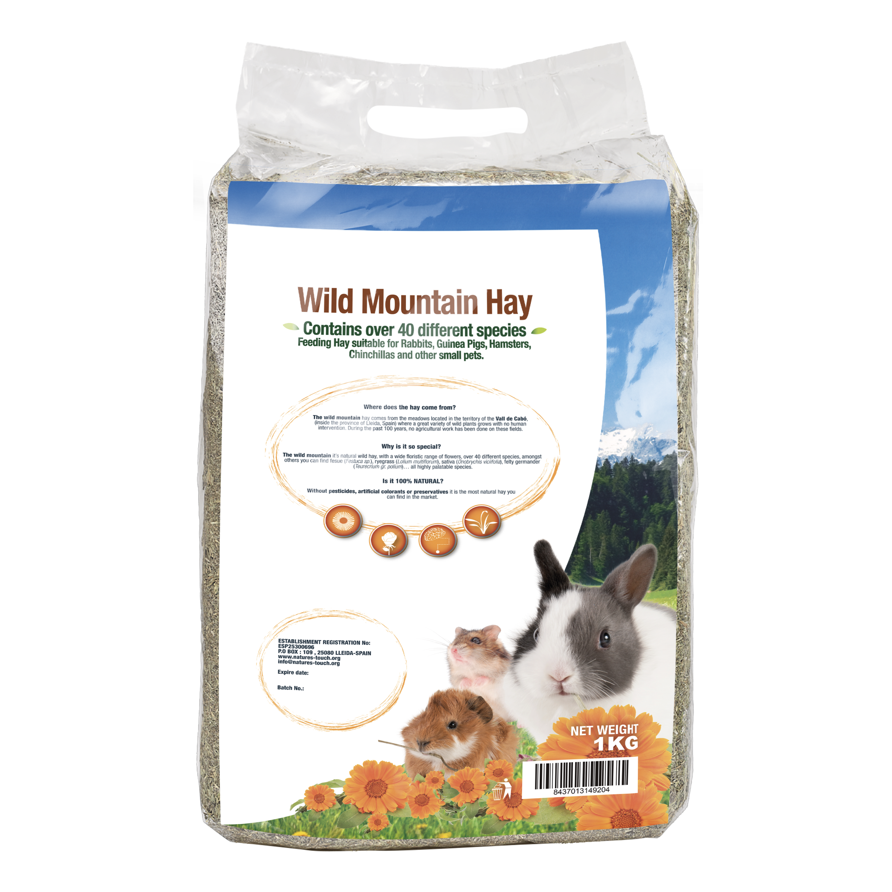 Wild Mountain Hay by Nature’s Touch comes from the meadows located in the territoriy of the Vall de Cabó (inside the province of Lleida, Spain), where a grat variety of wild plants grows with no human intervention. During the past 100 years no agricultural work has been done on these fields.